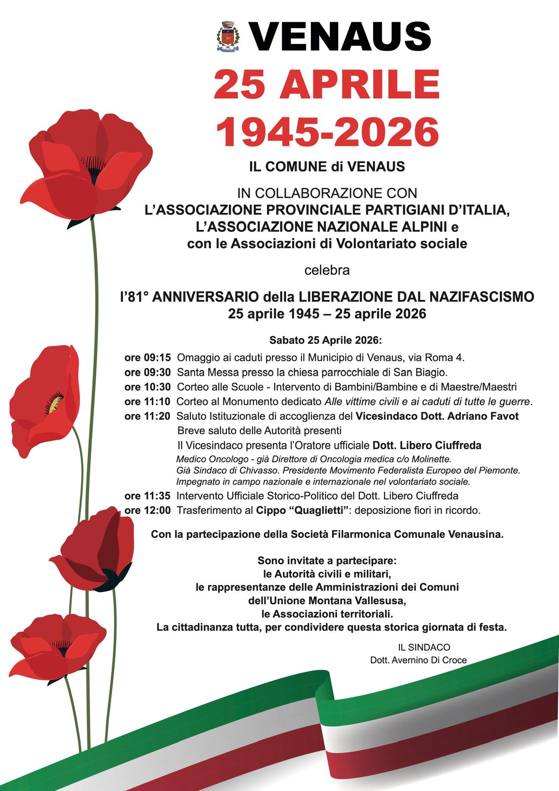 Il comune di Venaus in collaborazione con l'associazione Provinciale partigiani d'Italia e l'Associazione nazionale Alpini e con le Associazione di Volontariato sociale celebrano l'81 Anniversario della Liberazione dal Nazifascismo.