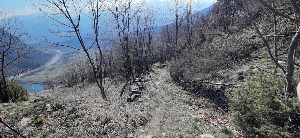 Qui inizia la parte più emozionante del percorso, con scorci panoramici spettacolari e passaggi aerei che regalano una vera immersione nella natura alpina. Il sentiero raggiunge la vecchia mulattiera dell’Abbazia della Novalesa (sentiero 586C) e poi la strada asfaltata che porta alla Frazione Panere. Dopo aver attraversato la frazione, una nuova pista forestale conduce verso Sant’Antonio e, successivamente, grazie a una bella mulattiera, fino alle case di Bar Cenisio, nei pressi della storica dogana della Finanza sulla SS25.