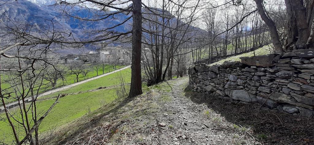 Il percorso prende avvio dal piazzale antistante l’Abbazia della Novalesa, dove incrocia il sentiero 581 “Via Francigena”. Costeggia inizialmente ampi terrazzamenti destinati un tempo alla castanicoltura: gradoni nobili, sostenuti da muri a secco, su cui si ergono ancora diversi castagni plurisecolari che sembrano custodire la memoria agricola del versante.