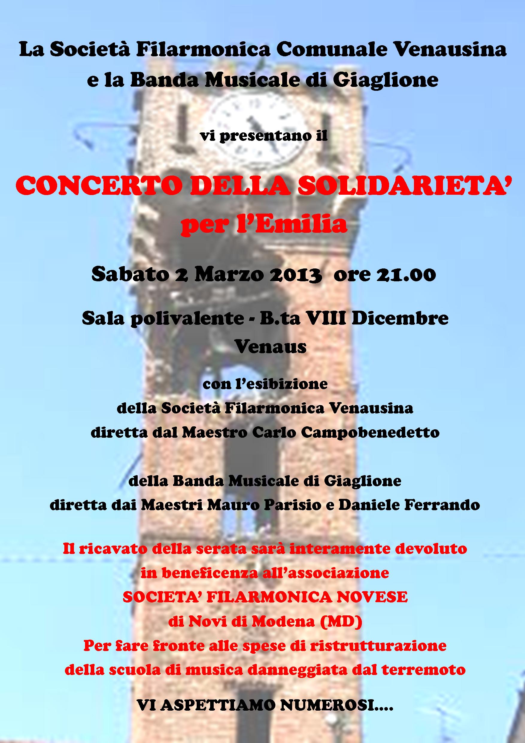 Il ricavato della serata sarà interamente devoluto in beneficenza all'Associazione SOCIETA' FILARMONICA NOVESE di Novi di Modena (MD) per far fronte alle spese di ristrutturazione per la scuola di musica danneggiata dal terremoto.