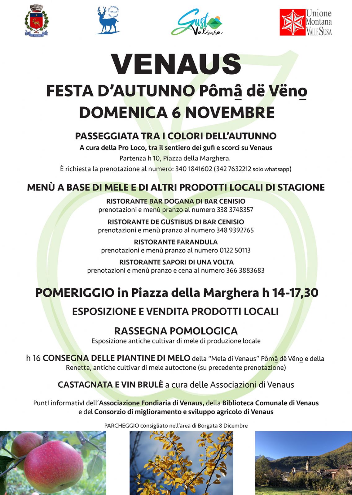 Abbiamo voluto intitolare la nostra Festa d’autunno “Pômâ dë Vëno” sia per festeggiare la distribuzione delle piantine di melo delle cultivar locali ai pomicoltori venausini, sia per promuovere la Rassegna pomologica di tutte le antiche cultivar presenti sul territorio di Venaus, curata da Marzo Gianmarco, che potrà essere unodei primi passi per la realizzazione di un catalogo volto a preservarne la loro presenza ed il loro importante patrimonio genetico.
