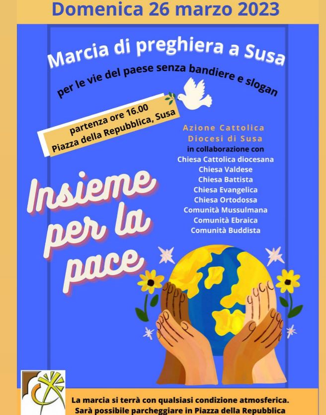L'Amministrazione Comunale di Venaus partecipa MARCIA DELLA PACE 26.03.2023 ORE 16.00 partenza da P.za della Repubblica organizzata dall'Azione Cattolica Valle di Susa in collaborazione con Chiesa Cattolica Diocesana , Chiesa Valdese, Chiesa Battista, Chiesa Evangelica, Chiesa Ortodossa, Comunità Mussulmana, Comunità Ebraica, Comunità Buddista.