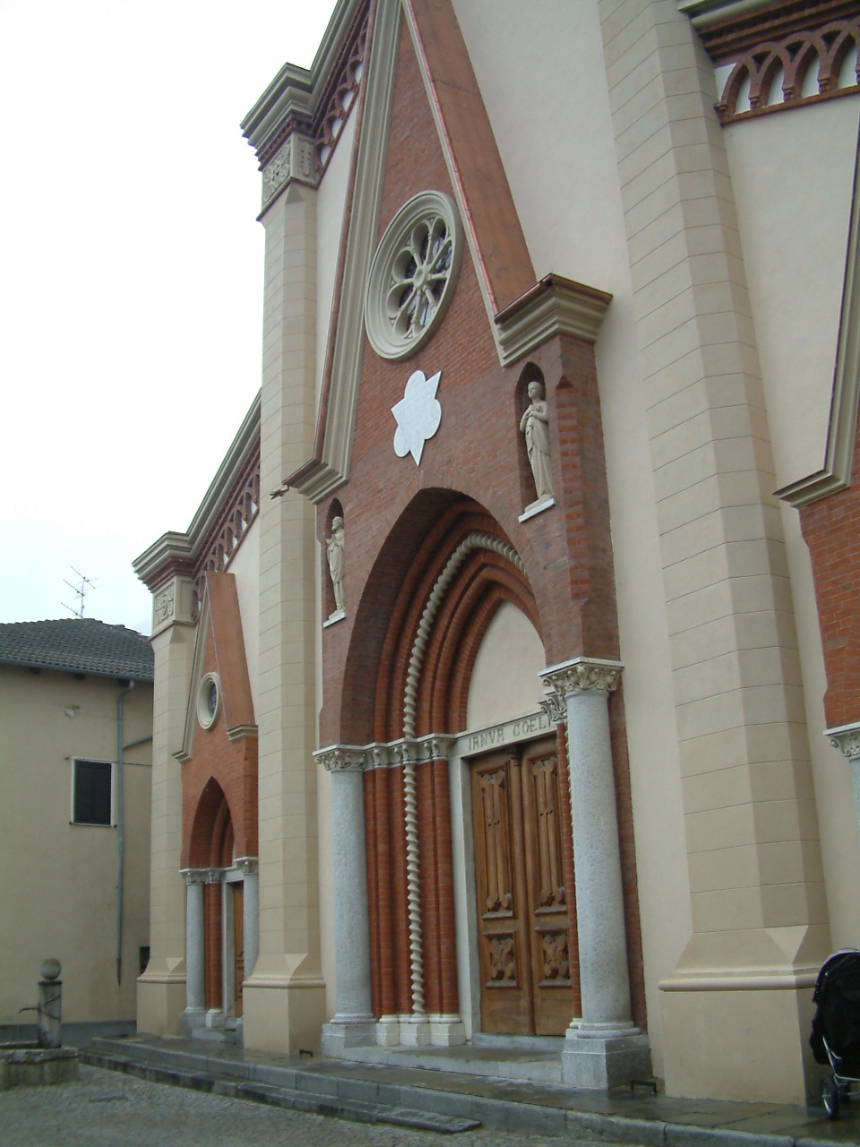 La facciata a salienti della chiesa, rivolta a levante, è suddivisa verticalmente da paraste in tre porzioni, ognuna delle quali presenta un portale d'ingresso strombato e sormontato da una ghimberga e da un rosone; sotto le linea di gronda corre una fila di archetti pensili